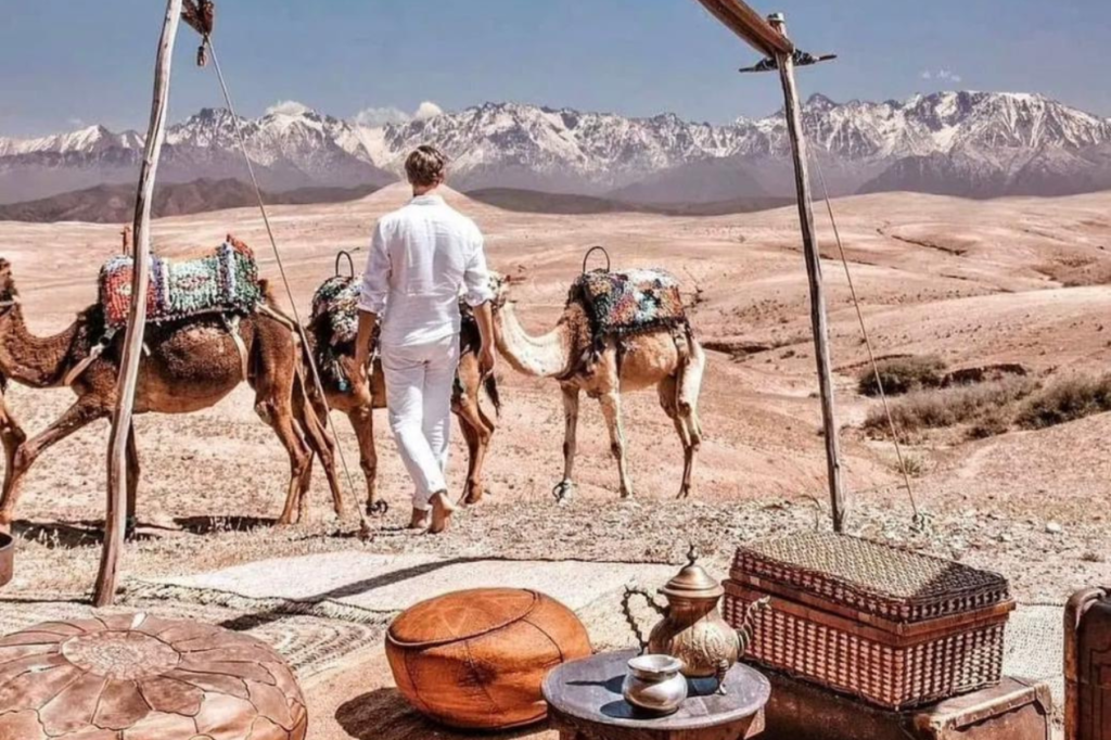 Escape the city for a magical Agafay Desert sunset featuring a scenic camel ride and a traditional Moroccan dinner. Enjoy live Berber and Gnawa music under the stars before your return to Marrakech, all with the stunning High Atlas Mountains as your backdrop.